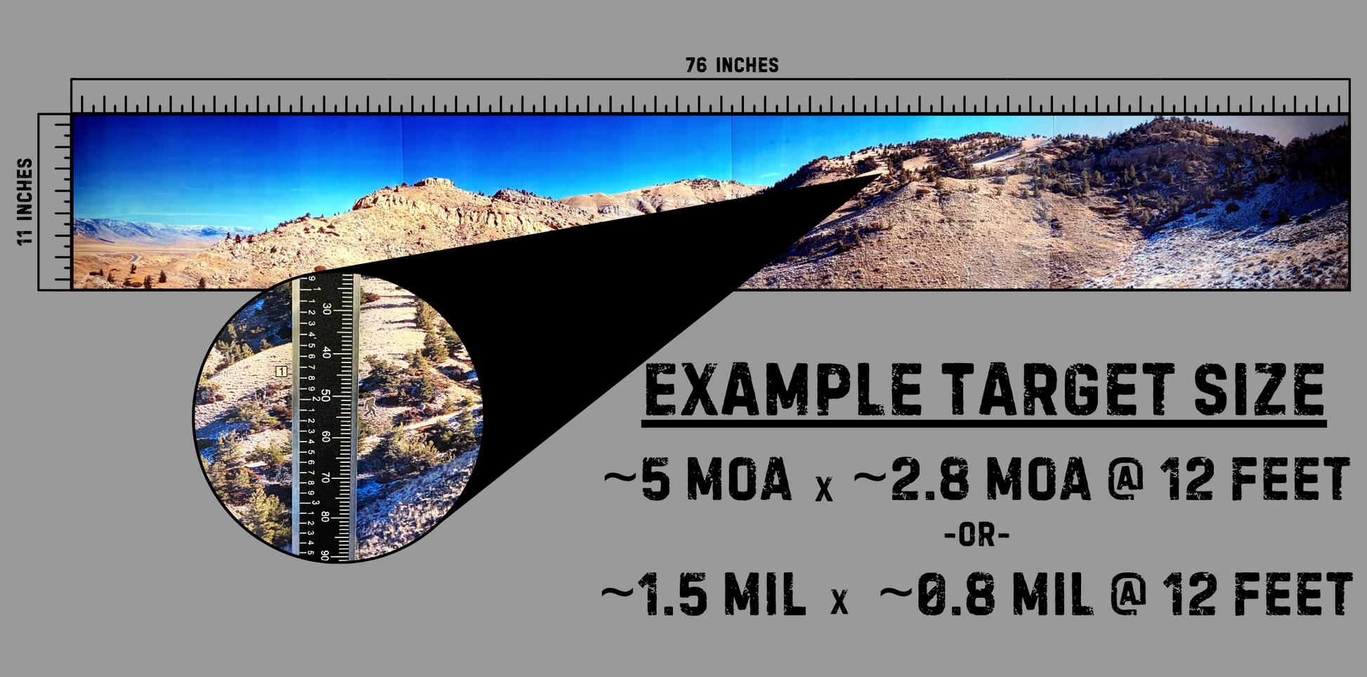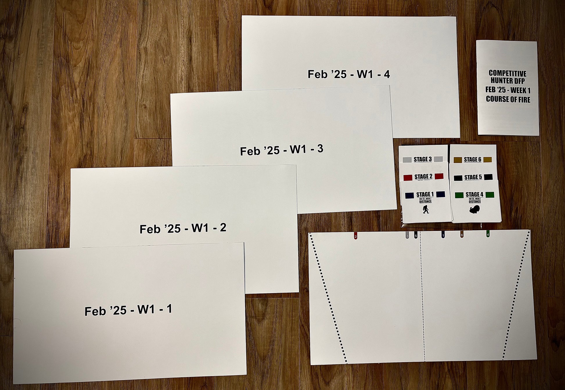 Each Competitive Hunter DFP comes with 4 posters which connect to make a 76”x11” panoramic range. Hidden in the range posters are animal silhouettes similar to the types you’d encounter at a hunter style match. Also included is 1 course of fire booklet with 5 – 7 stages, 1 set of range cards, and 1 sighter pin poster.